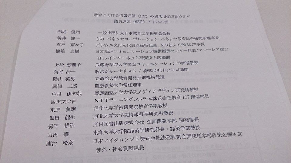 「教育における情報通信(ICT)の利活用促進をめざす議員連盟」有識者アドバイザーになりました(2015/02/26) ニュース 2015年02月27日 上松恵理子オフィシャルサイト > 研究室アーカイブ記事 > 「教育における情報通信(ICT)の利活用促進をめざす議員連盟」有識者アドバイザーになりました(2015/02/26) 「教育における情報通信(ICT)の利活用促進をめざす議員連盟設立総会」(2015/02/26)がありました。 私は有識者アドバイザーとなり、衆議院第一会館での会議に参加しました。 会議には党派を超えて大勢の議員の方々が参加されていて、 色々な立場の方々とお話することができました。 今回は設立総会。これから始動です。 前の記事へ 次の記事へ